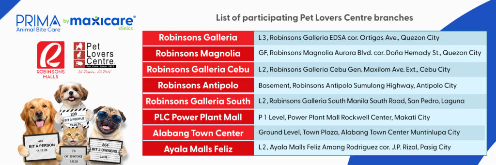Get a PRIMA Animal Bite Care discount voucher for every minimum single-receipt spend of ₱750 at any participating Pet Lovers Centre branch. You may redeem your discount when purchasing PRIMA Animal Bite Care via shop.maxihealth.com.ph. Promo runs from March 13 to June 13, 2026. Check the list of participating branches below. Per DTI Fair Trade Permit No. FTEB-250036 Series of 2026.